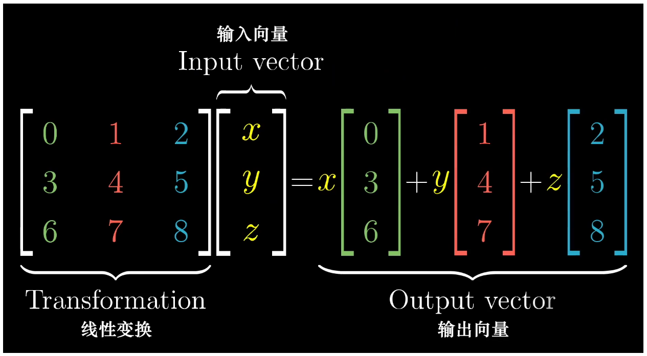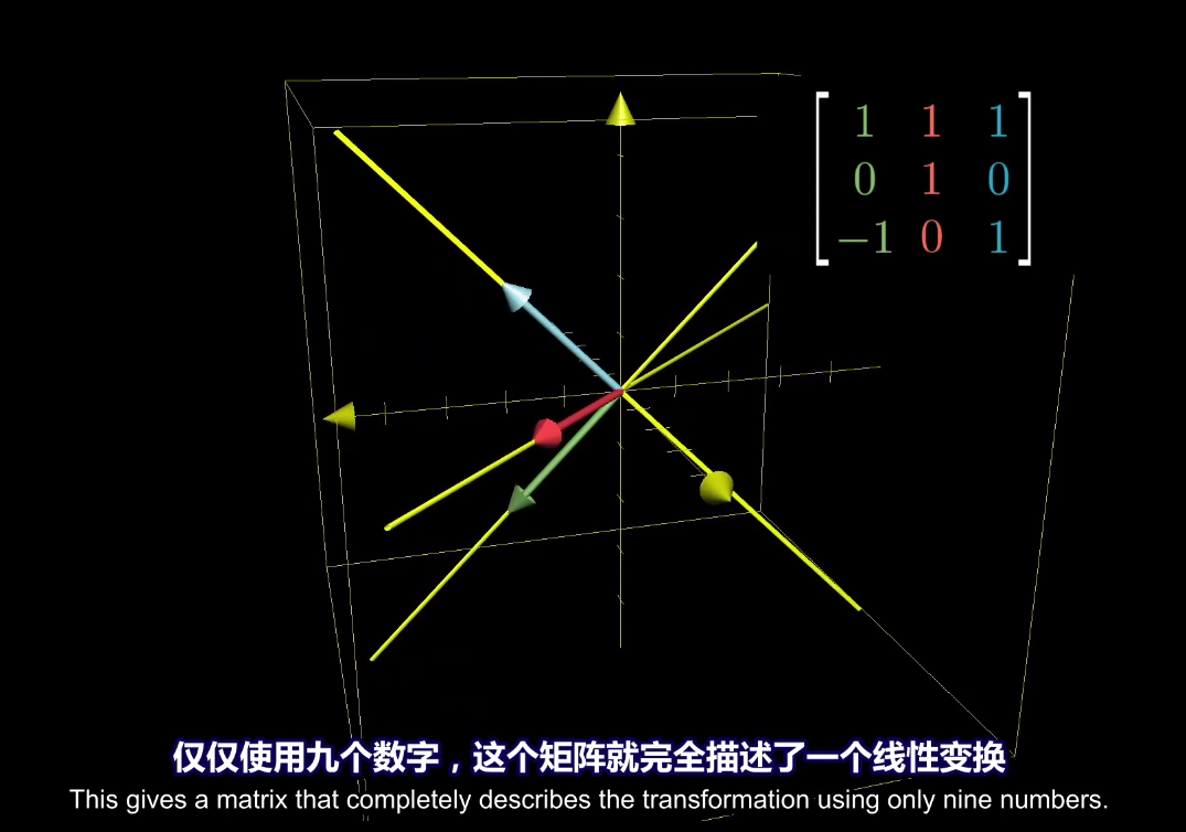 其实上面通过二维空间的得出的结论或者概念可以完美的推广大高维度空间,三维线性变换任然是由基向量的变换结果决定,只不过对于三维空间需要用三个基向量来描述 $\vec{i}$ 、 $\vec{j}$ 、 $\vec{k}$ 。