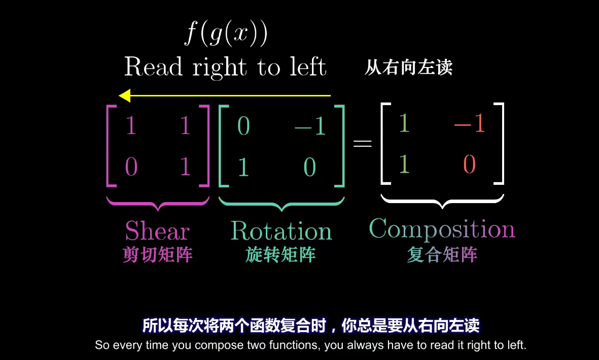 会得到一个新的线性变换,这个新的线性变换被称为前两个线性变换的复合变换。并且这个复合变换和其他线性变换没什么不同,可以直接用矩阵来描述,比如对于上面两个变换得到的复合变换,用矩阵描述就是 $\left[ \begin{matrix} 1 & -1 \ 1 & 0 \end{matrix} \right] $