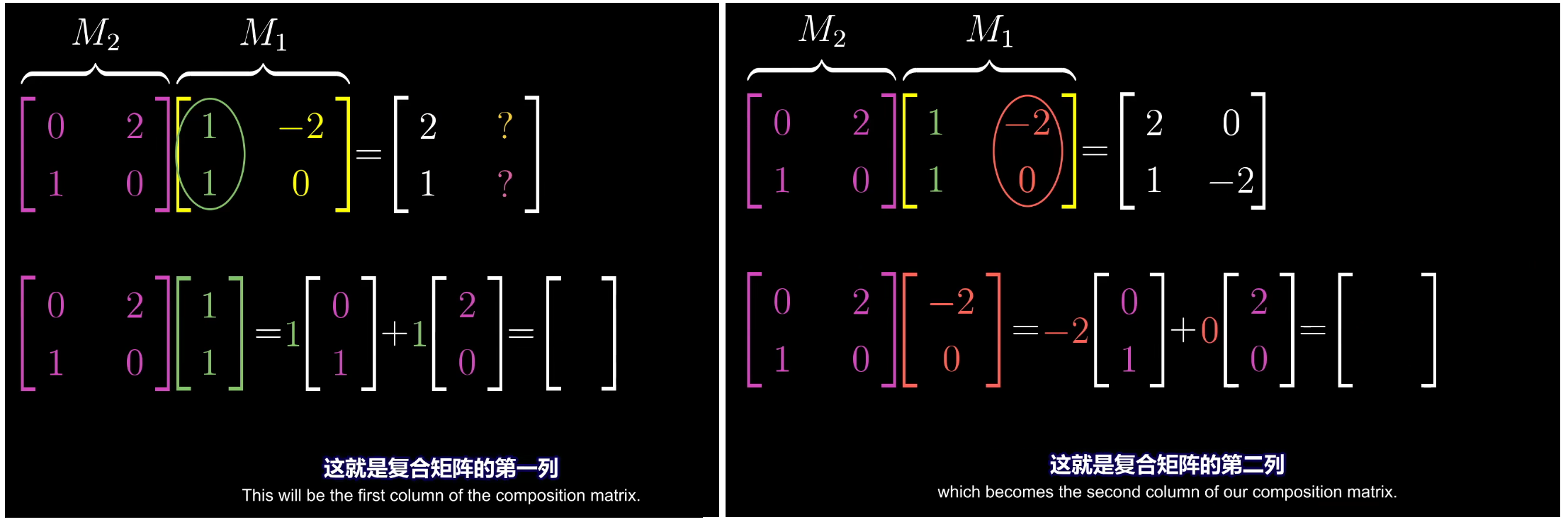 其实下面这两个矩阵相乘,本质就是 $M_2$ 矩阵对 $M_1$ 矩阵的第一个向量(也就是第一列)做矩阵乘法,得到复合矩阵的第一个向量,然后 $M_2$ 矩阵对 $M_1$ 矩阵的第二个向量(也就是第二列)做矩阵乘法,得到复合矩阵的第二个向量,然后就得到了复合矩阵: