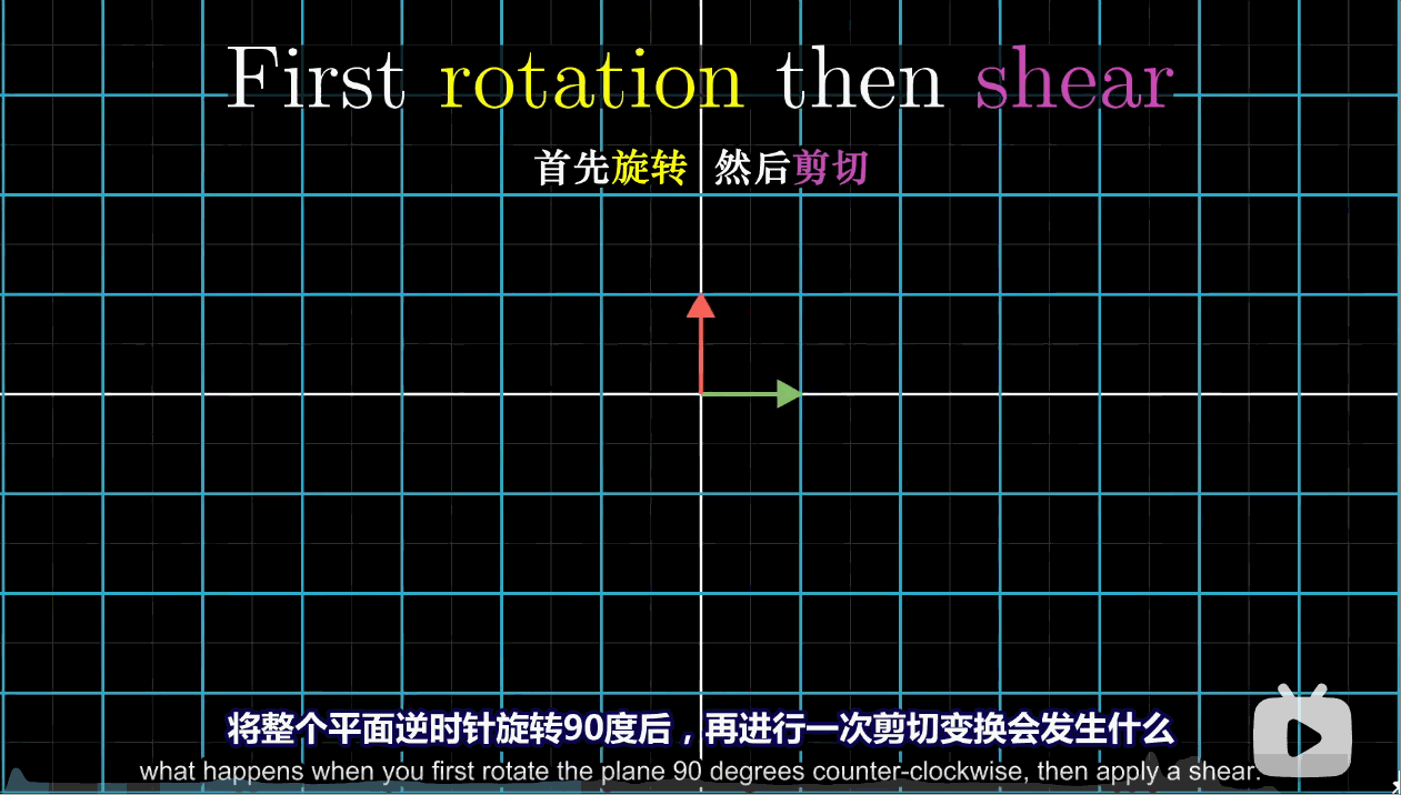 首先是一个旋转90°的线性变换,矩阵描述 $\left[\begin{matrix}0&-1 \ 1 &0 \end{matrix} \right]$,再进行剪切操作,矩阵描述 $\left[ \begin{matrix} 1 & 1 \ 0 & 1 \end{matrix} \right] $
