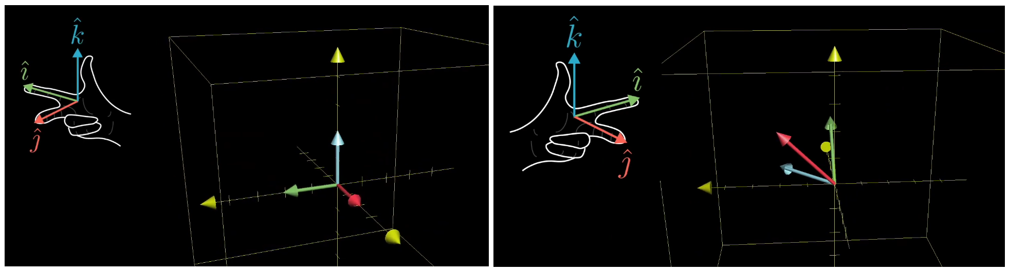 那么对于三维空间来说,当行列式的值为负数时又表示什么呢?其实还是改变了空间的定向,只不过这个时候判断空间定向是否被改变可以用右手定则来判断,如果左手成立的话那么就意味着空间的定向发生了改变: