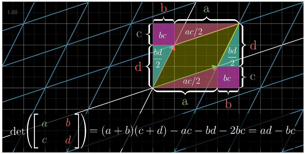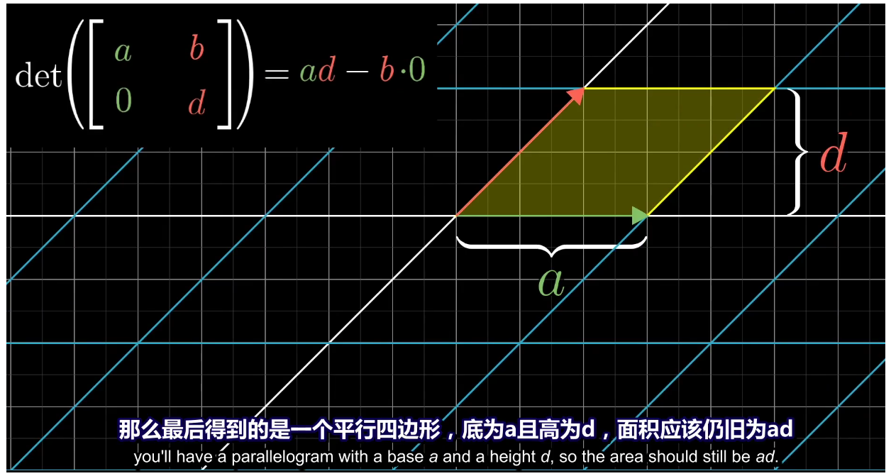 那么如果b、c均不为0呢?那么b、c项就会告诉你平行四边形在对角方向上拉伸了或者压缩了多少,下面这张图可以帮助我们理解为什么是 $a\times d - b\times c $: