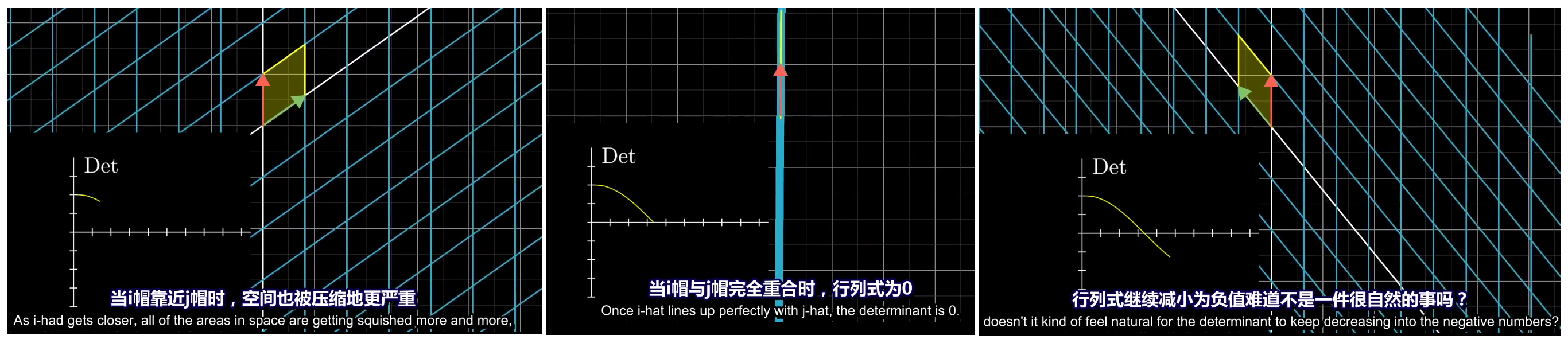 $\vec{i}$ 靠近 $\vec{j}$ 时,空间也被压缩得更加严重,这意味着行列式无限趋近于0,当 $\vec{i}$ 与 $\vec{j}$ 重合的时候,行列式值为0,如果 $\vec{i}$ 继续往左偏移,行列式继续减小为负值,看起来是一件非常自然且合理的事情: