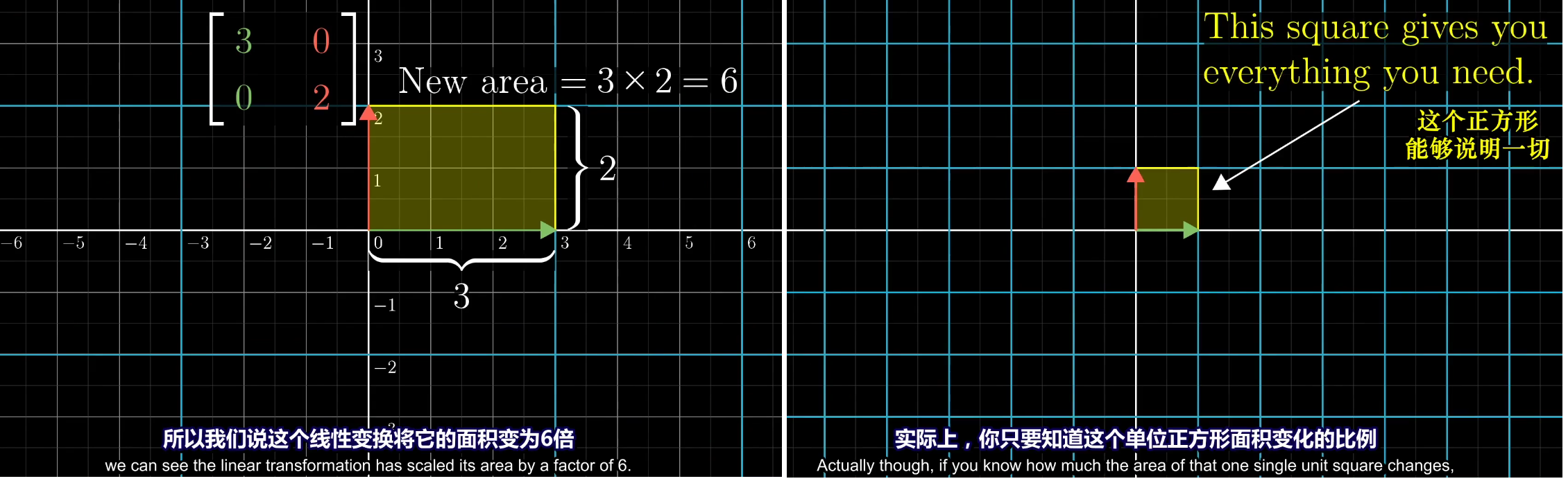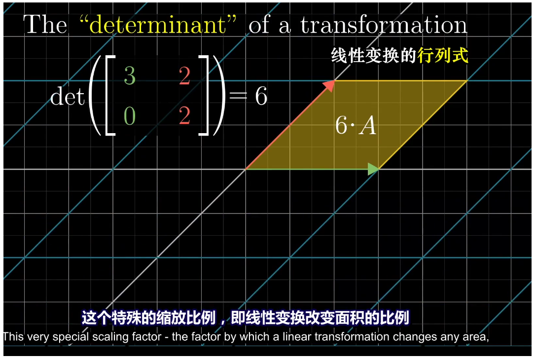 比如下面的矩阵所代表的线性变换将原本$\vec{i}$ 、 $\vec{j}$ 所形成的矩阵面积扩大了6倍: