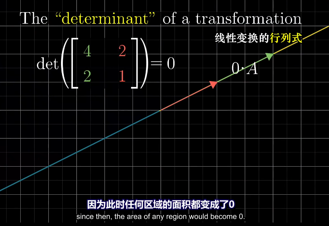 所以如果我们一旦得知一个矩阵的行列式值为0,就等于知道了这个矩阵所表示的线性变换是否会将空间压缩到更低的维度,一条线上,甚至是一个点上。
