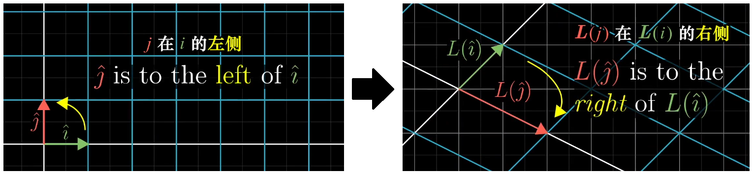 把二维空间想象成一张纸,某些线性变换看起来就像是纸张被翻转到了另一面一样,类似的线性变换改变了空间的定向。或者从 $\vec{i}$ 、 $\vec{j}$ 的方式来考虑,开始 $\vec{i}$ 在 $\vec{j}$ 的左边,如果线性变换后 $\vec{i}$ 在 $\vec{j}$ 的右边,则改变了空间的定向: