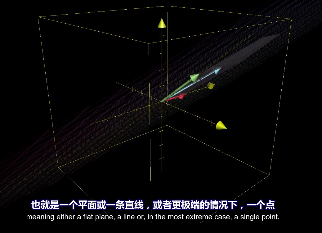 对于三阶行列式来说,表示的则时体积的缩放。我们只需要关注 $\vec{i}$ 、 $\vec{j}$ 、 $\vec{k}$ 形成的单位立方体在经历过线性变换之后的情况就可以了。这个时候如果行列式的值为0,也就意味着这个矩阵所表示的线性变换是否会将空间压缩到一个面,甚至是一条线上,甚至是一个点上。