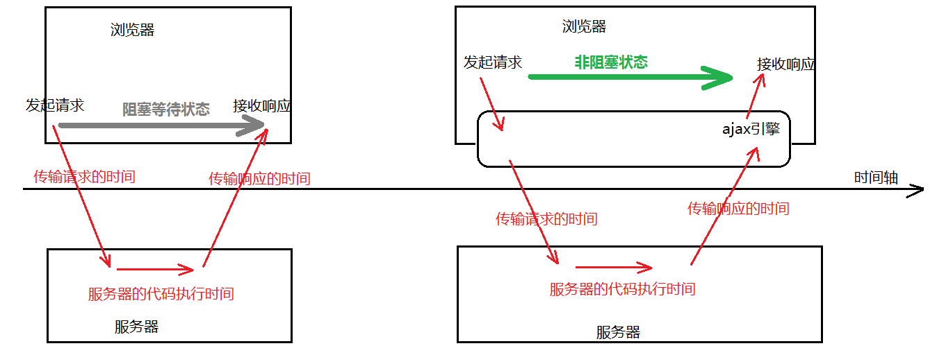 很显然,如果没有ajax引擎的情况下发起请求而且等到收到响应对于浏览器来说是非常浪费时间的,尤其是发起的请求计算量过大,网速特别慢的时候是非常影响用户体验的,有了ajax引擎替我们发起请求和接受协议,浏览器就有机会去做其他的事情,而不是傻傻的等待!