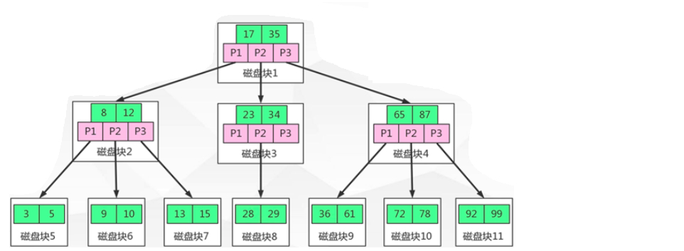 如果要查找数据项29,那么首先会把磁盘块1由磁盘加载到内存,此时发生一次O,在内存中用二分查找确定29在17和35之间,锁定磁盘块1的P2指针,内存时间因为非常短(相比磁盘的IO)可以忽略不计,通过磁盘块1的P2指针的磁盘地址把磁盘块3由磁盘加载到内存,发生第二次IO,29在26和30之间,锁定磁盘块3的P2指针,通过指针加载磁盘块8到内存,发生第三次IO,同时内存中做二分查找找到29,结束查询,总计三次IO。