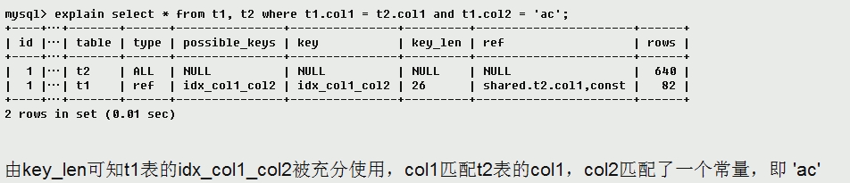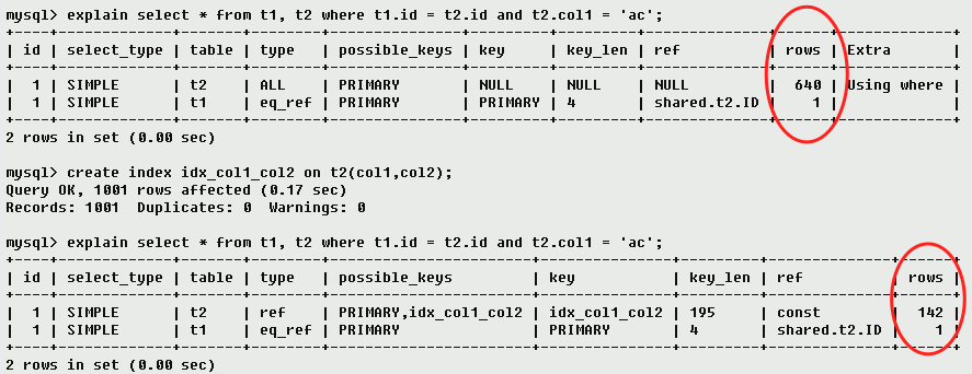 通过上面的例子进行分析,在没建立索引前,扫描了641行,先加载t2,再加载t1,查询t2表的时候是ALL,也就是逐行扫描,并且本来可以使用主键索引,但是依旧没什么意义,所以还是以逐行扫描的方式进行查询,这样会有640行结果。接下来对t2表建立复合索引,所以可供选择的索引就有主见索引、自己新建的复合索引。很明显,新建复合索引之后呢,查询的时候不再采用逐行扫描的方式,而是选择了复合索引,行数降到了142行,总共143行就可以搞定这个查询问题!