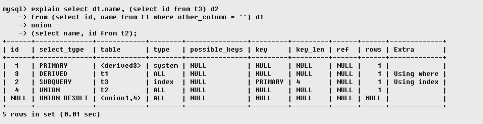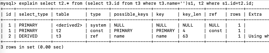 第二行(执行顺序2):id为3,是整个查询中第三个selec的一部分。因查询包含在from中,所以为 derived【 select id, name from t1 where other_column="】