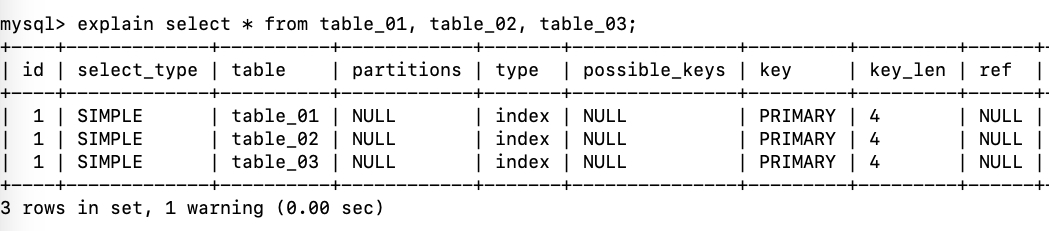 PRIMARY就是主查询,id越大越先被执行,则毫无疑问在这样的子查询中,肯定最先要查询的表就是table_03,所以这是MySQL自己约定的顺序,就和运算符优先级一样!SUBQUERY 代表最外层查询。