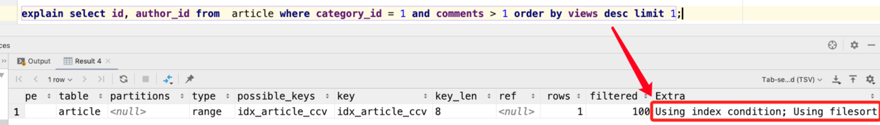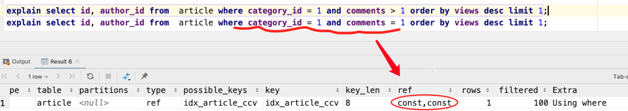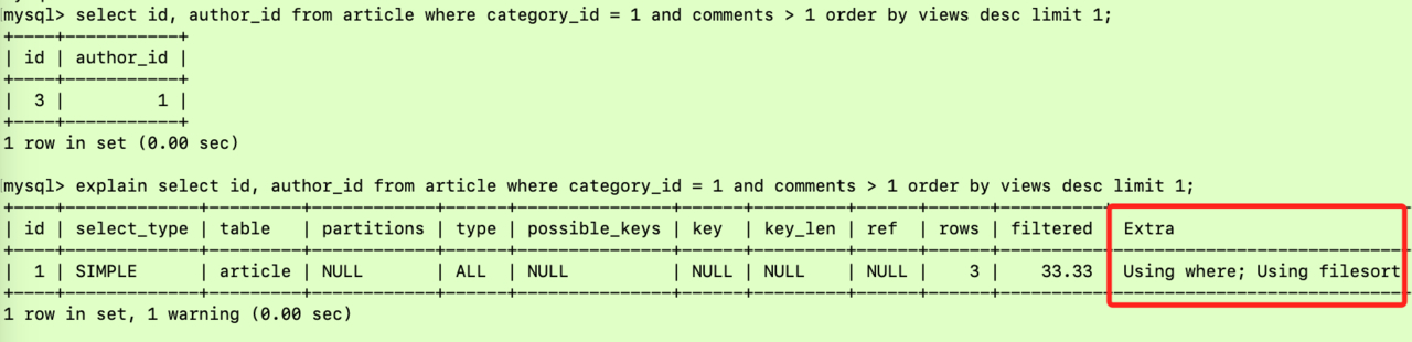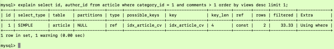 explain select id, author_id from article where category_id = 1 and comments > 1 order by views desc limit 1;