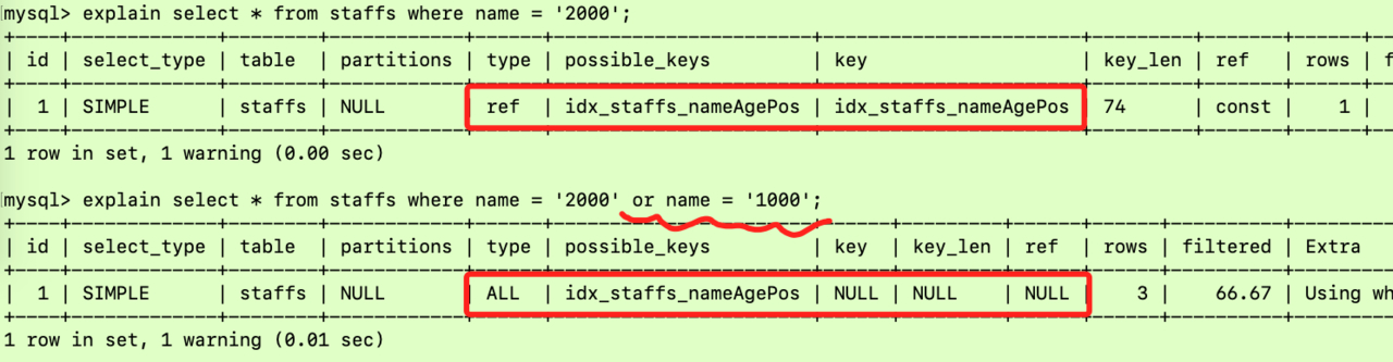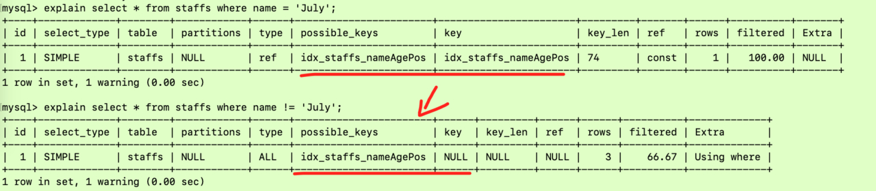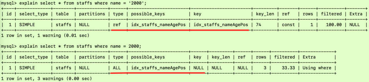 这是为什么呢?因为MySQL自动识别name是一个varchar类型,所以如果没有在SQL语句中没加单引号,MySQL会自动发生隐式类型转换,所以参考第三条,这必然导致索引失效,在开中应该尽量避免