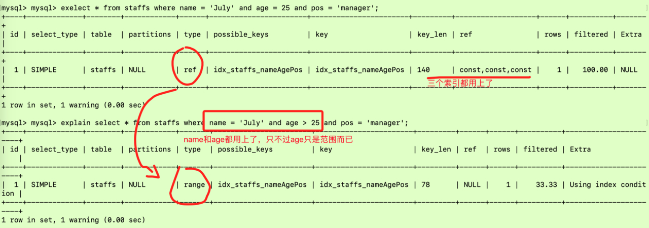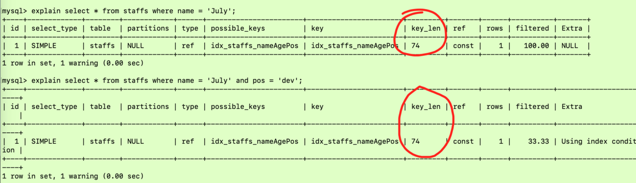上面这条SQL很显然用到了索引,但是key_len还是74没变,其实这条SQL只用到了name索引,并未用到pos索引。这违反了最佳左前缀法则,因为age索引还没用到就用pos,肯定pos会无效的。拿上面的火车举例子,如果中间的车厢断开了,后面的车厢肯定也动不了了。所以最佳左前缀法则还是很重要的!