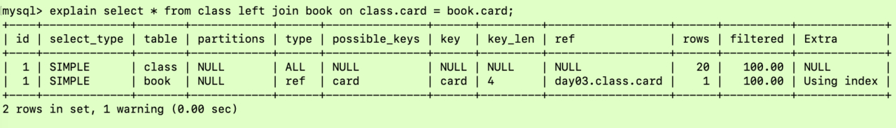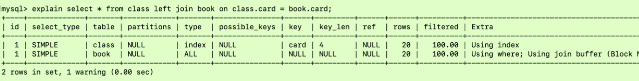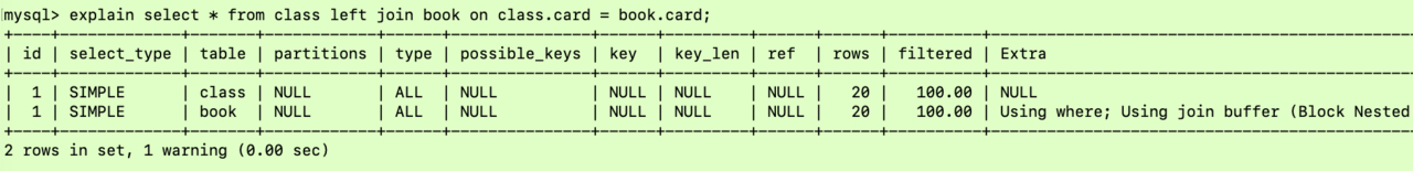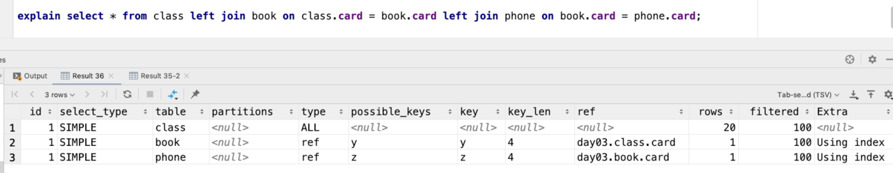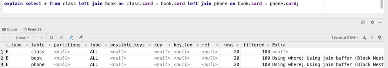 explain select * from class left join book on class.card = book.card left join phone on book.card = phone.card;