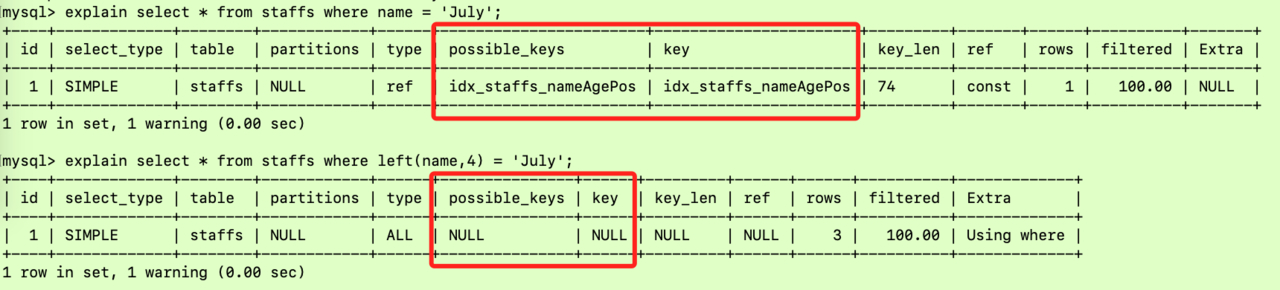 explain select * from staffs where name = 'July' and pos = 'dev';