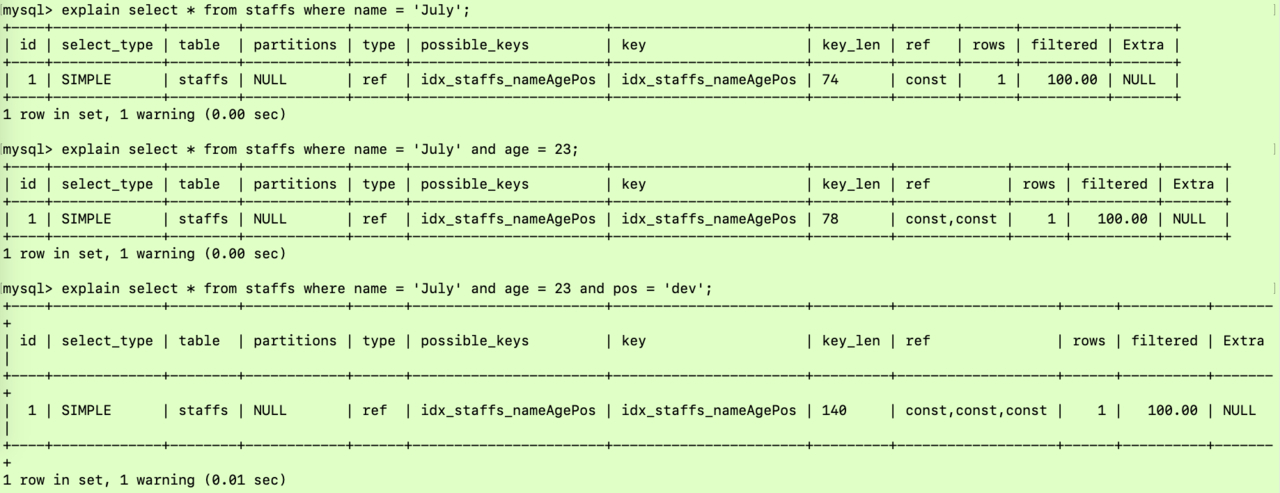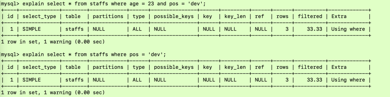 explain select * from staffs where name = 'July' and age = 23 and pos = 'dev';