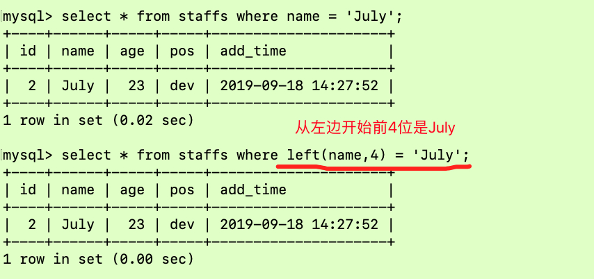 通过上面的例子可以看出,like的%尽量加在右边。而且like查询是一个范围查询!