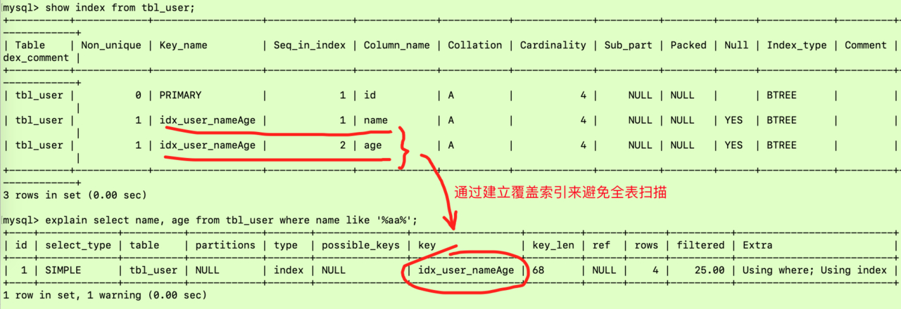 通过建立覆盖索引来避免全表扫描,从下图可以看出类型为index: