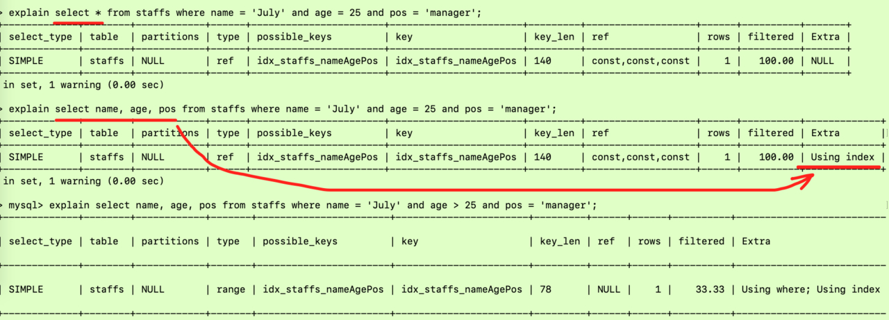 可以看出如果只是要检索字段,那就尽量明确写出需要查询的字段,不要写select * ,只查询索引字段的话就会使用Using index,而不是Using where。