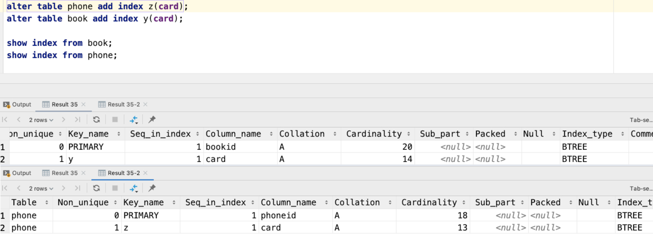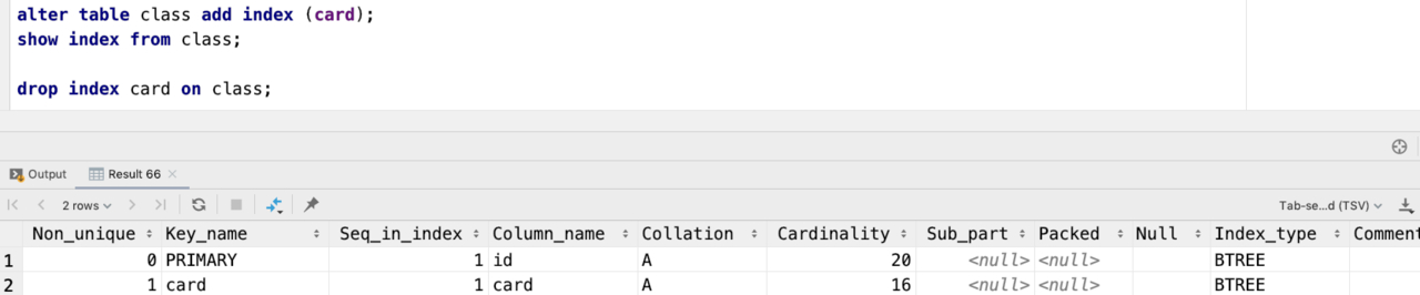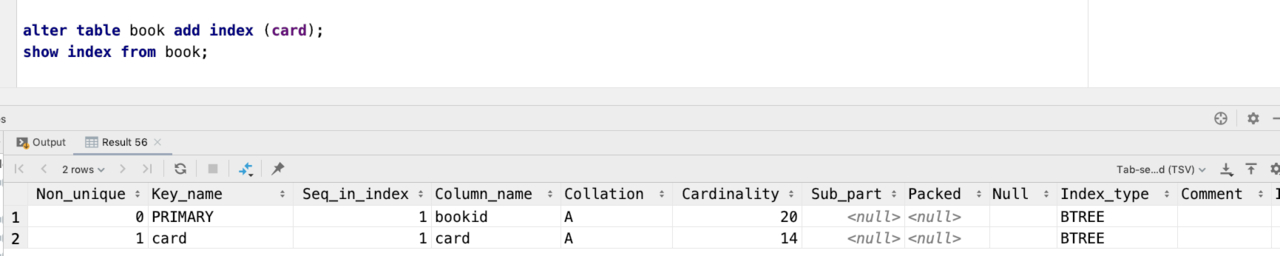 | Table | Non_unique | Key_name | Seq_in_index | Column_name | Collation | Cardinality | Sub_part | Packed | Null | Index_type | Comment | Index_comment |