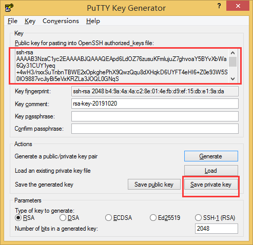 第四步:保存生成功的密钥: 点击保存私钥(Save Private Key),保存一个.ppk文件。