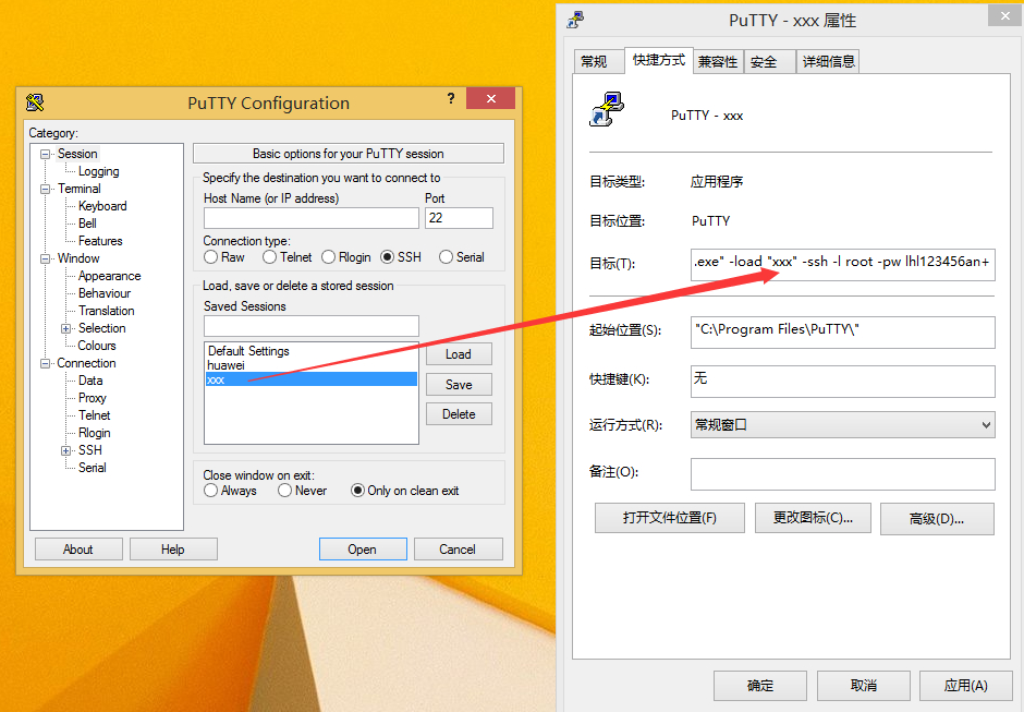 "C:\Program Files\PuTTY\putty.exe" -load "xxx" -ssh -l root -pw lhl123456an+