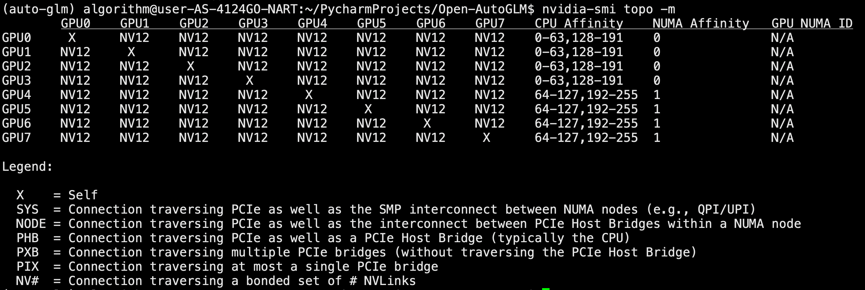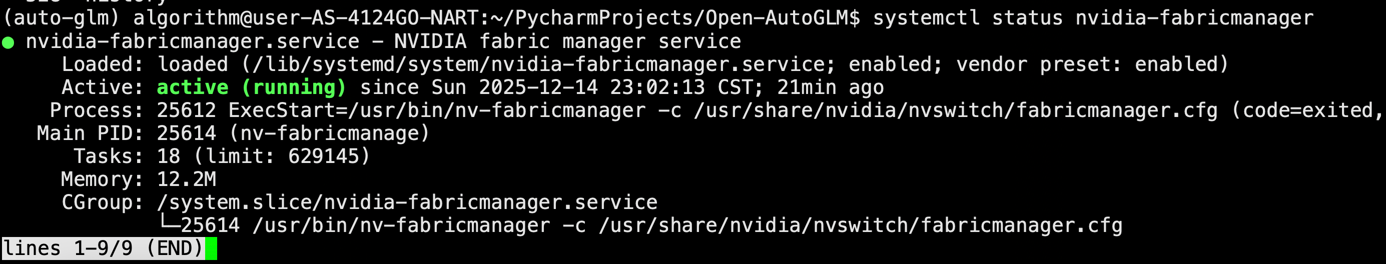 能看到 GPU 之间出现 NVLink/XGMII 即表示 Fabric Manager 正常工作。